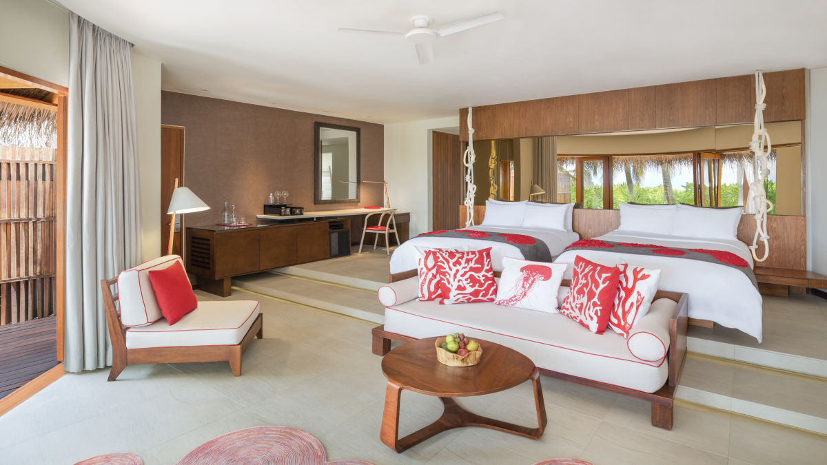 A tágas, emeletes villa közvetlenül a tengerparton található, zavartalan pihenést biztosítva a vendégek részére. A légkondicionált villában zuhannyal és káddal felszerelt, félig nyitott fürdőszoba, hajszárító, fürdőköpeny és papucs, széf, síkképernyős televízió, vasaló és vasalódeszka, telefon, valamint kávé- és teafőzési lehetőség áll a vendégek rendelkezésére. A privát napozóteraszon medence és napozóágyak helyezkednek el.