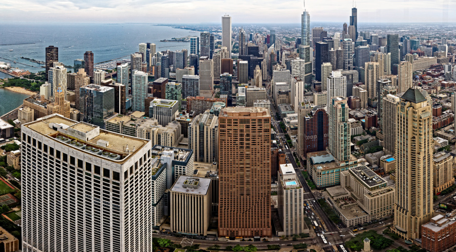 A felhőkarcolók mellett a legtöbbet fényképezett téma a tóparti homokos föveny, ami mentén kialakult a belváros. Chicago elsősorban újító szellemű építészetéről híres. 1871-ben egy tűzvész teljesen elpusztította a települést, melynek újjáépítése igazi kihívást jelentett a kor építészei számára. Határtalan kreativitásuk bizonyítékaként itt épült fel a világ első felhőkarcolója.