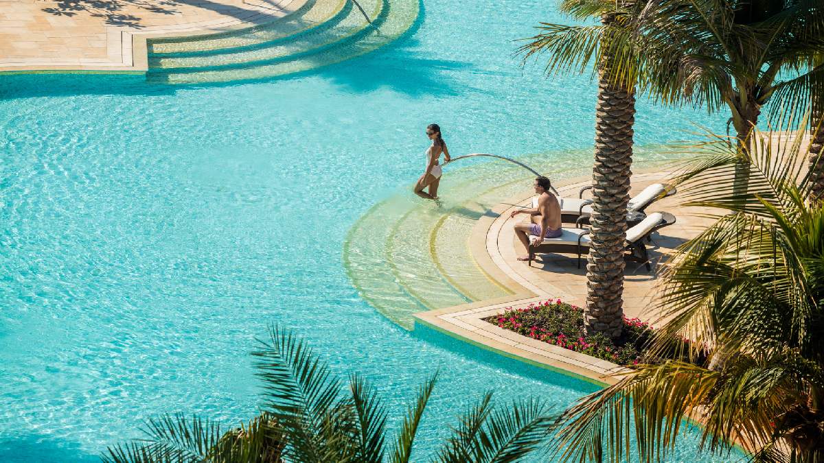 - Sport és szórakozás: Két kültéri medence – az egyik víz alatti zenével, bérelhető cabanák, gyermekklub, edzőterem, két teniszpálya, a tengerparton ingyenes nem motorizált és térítéses motorizált vízi sportok (kajak, vízi-sí, szörf, banán, ejtőernyőzés, fly-fish és jet-ski) szolgálják a vendégek kényelmét. A sivatag és tenger inspirálta Pearl Spa tíz kezelőszobával és deluxe termálvizes élményekkel, gőzkabinnal, fűtött pezsgőfürdővel várja a testi-lelki felfrissülésre vágyókat, továbbá része még egy fedett úszómedence és a 24 órán át nyitva tartó fitnesz center is. A Spa kezelései térítés ellenében vehetők igénybe.