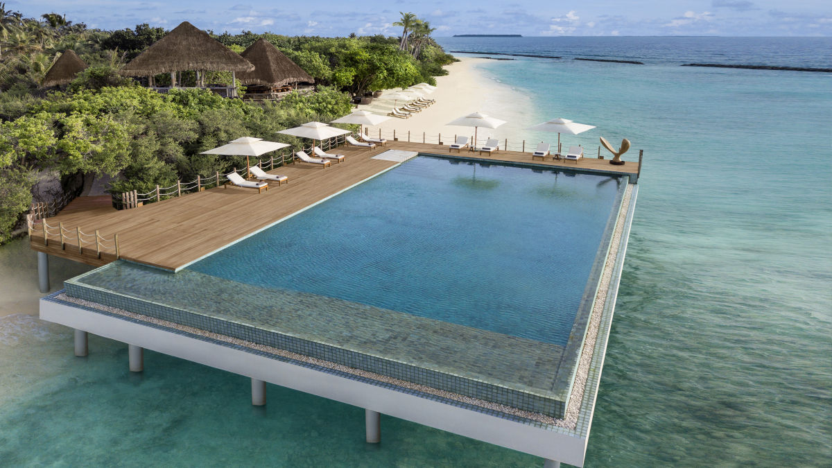 Igény szerint víz fölé épült, természetes anyagok, köztük fa és kő felhasználásával berendezett, saját napozóterasszal és medencével rendelkező villa is bérelhető.
