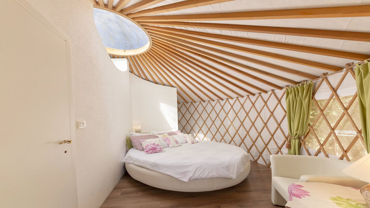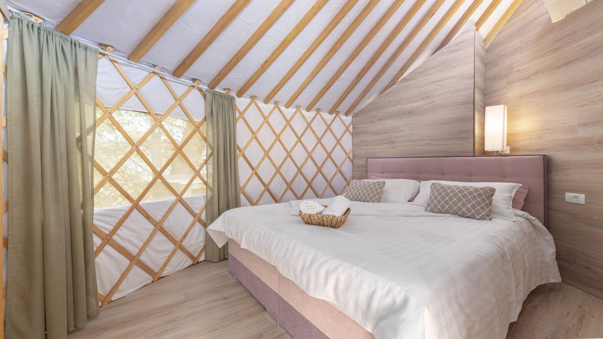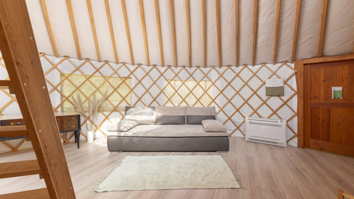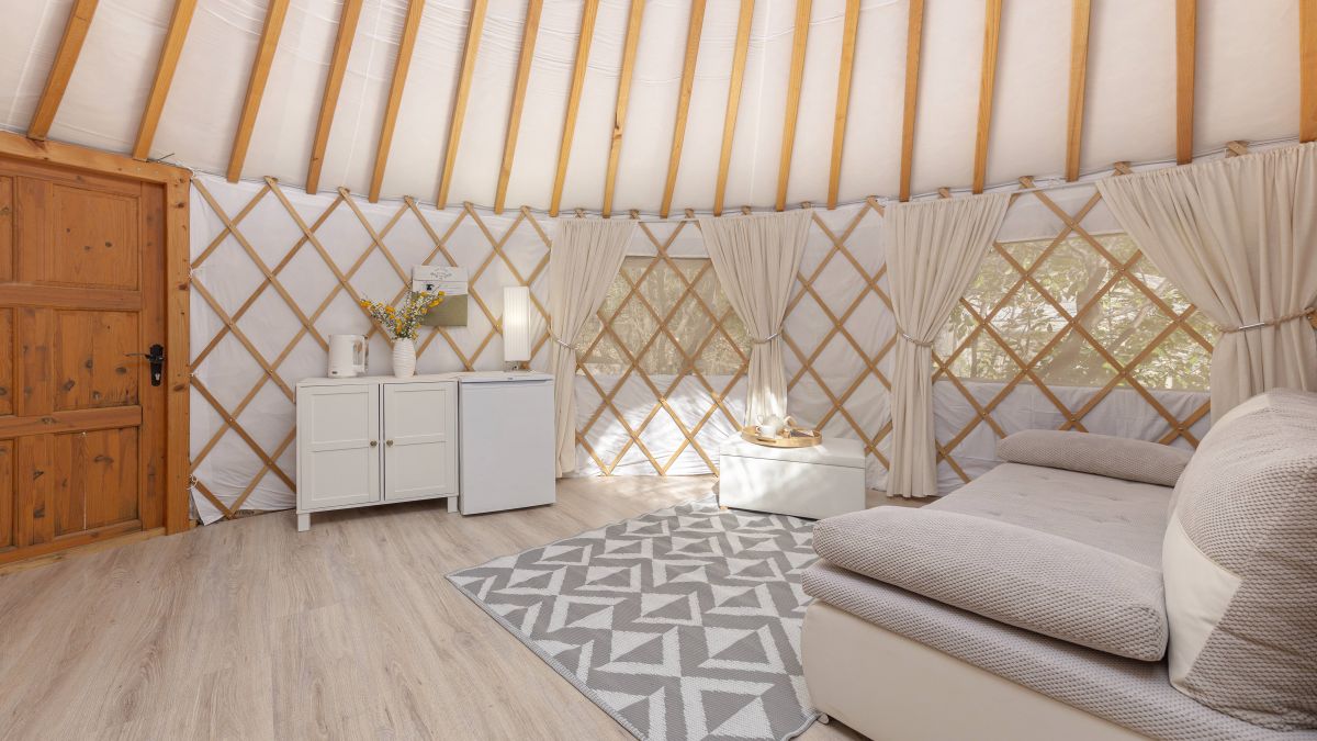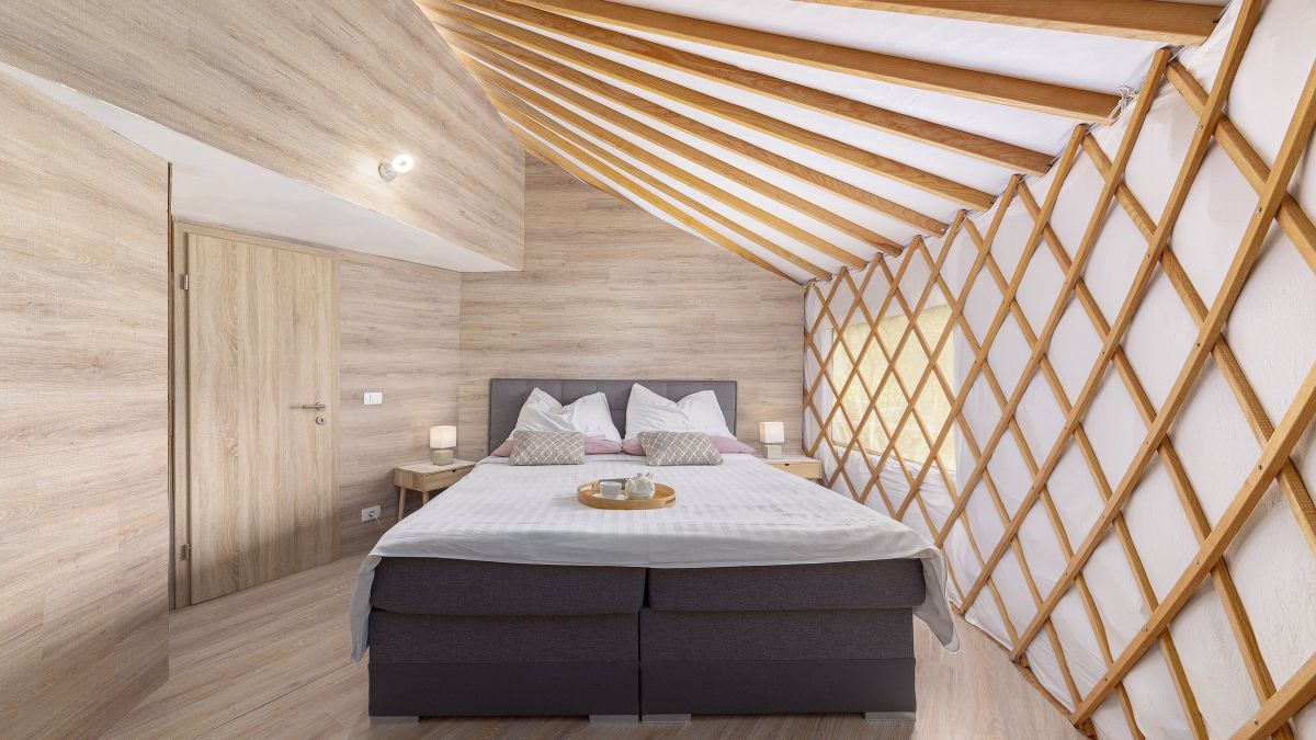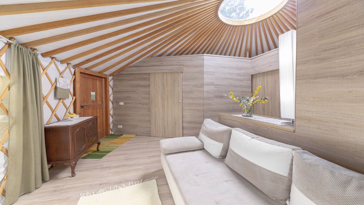 A 30 négyzetméteres jurta kis méretű franciaággyal és kanapéval felszerelt. A jurták privát fürdőszobával vannak ellátva, ahol WC, mosdó és zuhanyzó áll rendelkezésre. Ágynemű és törölköző biztosított. A jurta kupolájának közepe nyitott, így belülről is megcsodálható a csillagos égbolt. A jurta kapacitása 4 fő befogadására alkalmas. Nagyobb, 6 és 8 fő befogadására alkalmas hójurták igény szerint lekérhetők.